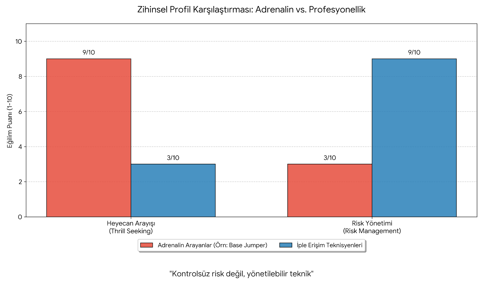 Sektördeki en büyük yanılgı, iple erişim teknisyenlerinin tehlikeyi seven “adrenalin bağımlıları” olduğu yönündedir. Ancak sosyolojik veriler bunun tam tersini söylüyor.
