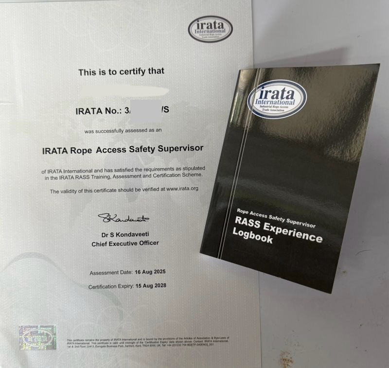 RASS Logbook; Bu defter normal IRATA logbook’unda bağımsız bir numara taşıyor. Operasyonel deneyimleri + IRATA online RASS CPD kurslarını belgelemek için kullanılıyor. Eğer çalışılan şirket zorunlu tutmuyorsa bu bir gereklilik değil.