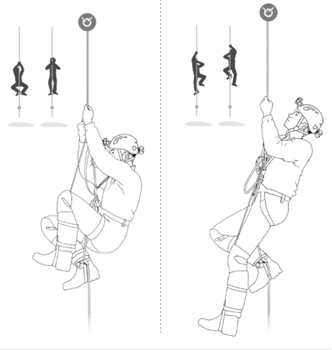 Birazda mağarada ip üzerinde nasıl kullanıldığına bakalım. Burada da tamamen kullanıcının zevkine kalmış iki yöntem var. İlki, aşağıda sol tarafta gösterilen üzengi ile pantin i aynı anda kullanarak yükselmek. İkincisi ise sol tarafta gösterildiği gibi. Üzengi ve pantin i art arda sanki merdivende çıkıyormuş gibi kullanarak yükselmek.